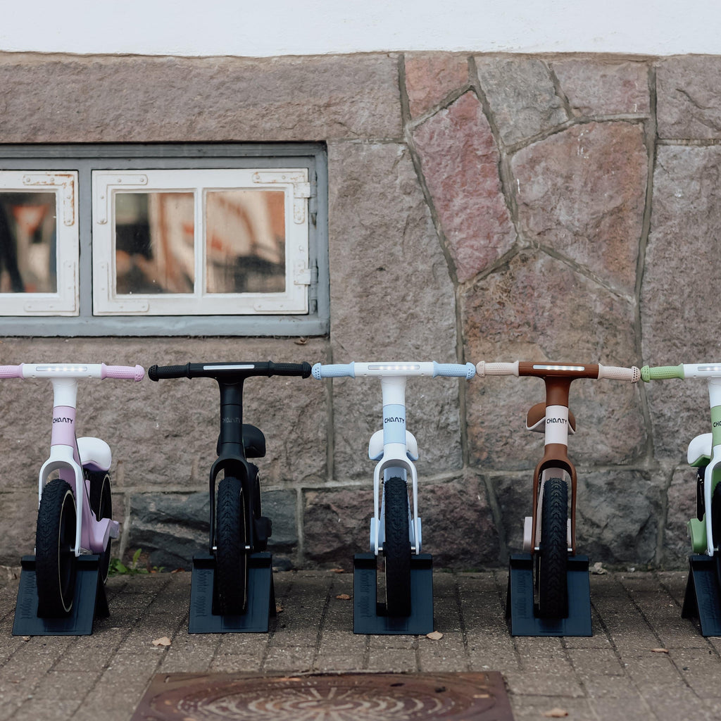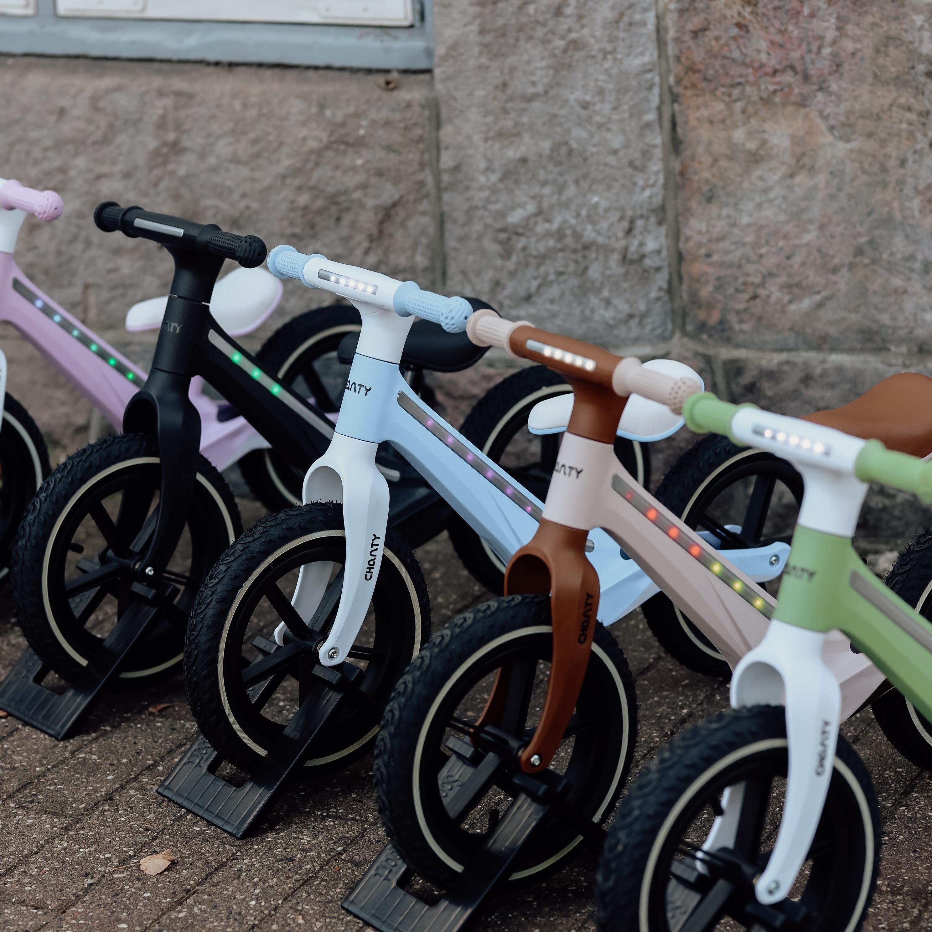 The CHANTY Go 4-pack is the ultimate family solution, providing four black balance bikes with integrated LED lights. Perfect for families with multiple children, kindergartens or daycare centers. The bikes are light, stable and ideal for training balance and motor skills. Made of durable PP and nylon with pneumatic tires, ergonomic handles and adjustable saddle.